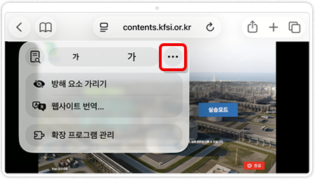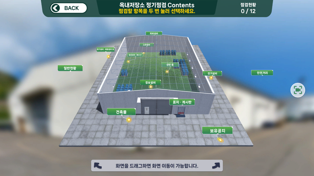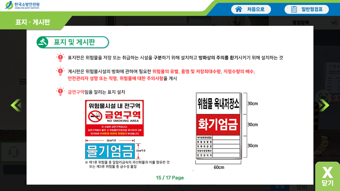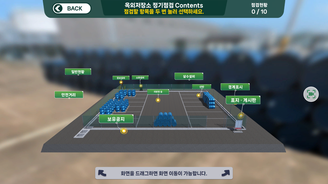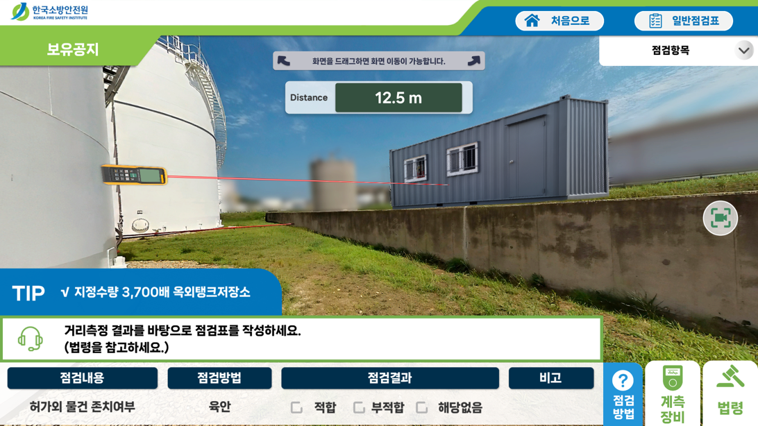 | 점검실습 | 선택한 점검항목에 대한 세부 점검내용에 대하여 실사기반의 360도 이미지를 통해 교육생이 직접 현장을 조작하며 점검을 수행하고 점검결과를 작성 | ![]() |